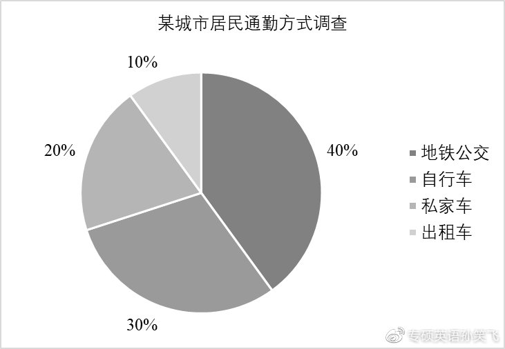 这个饼状图展示了一项关于居民每天最喜欢的通勤方式的调查结果。我们可以看到地铁和公共交通占据了最大的份额,为40%。紧随其后的是自行车、私家车和出租车,分别占30%、20%和10%。