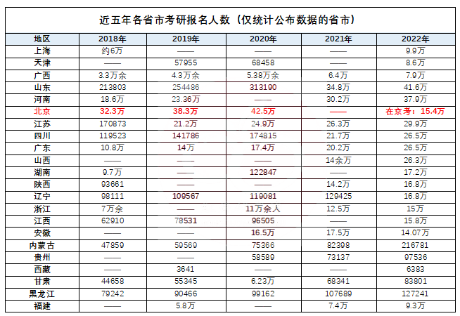 但作为清北众多名校所在地的首都,考研或许最卷?从各省市公布考研人数来看,除了考研大省河南、山东外,北京市的考研人数近5年来都较高。