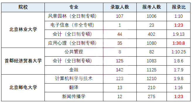 除此之外,部分院校专业报录比基本在1:10左右,甚至有专业出现1:30的超高报录比。