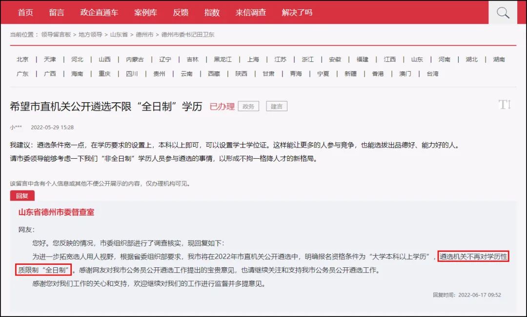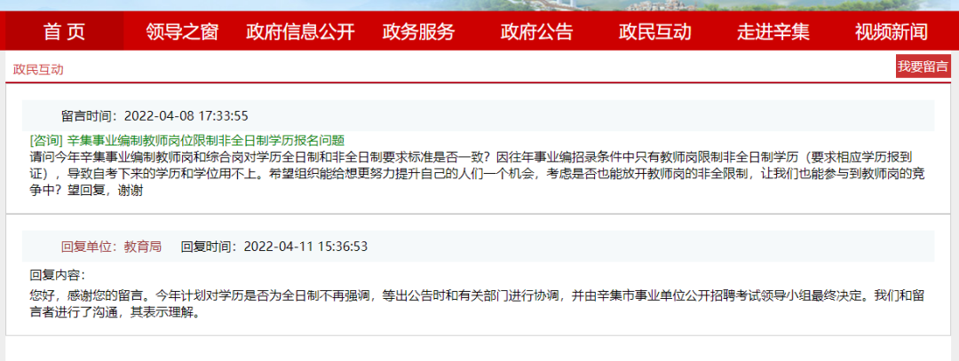 在2022年早些时候,有考生在政民互动留言板上提问关于河北省辛集市事业单位的学历问题,也得到官方回复: