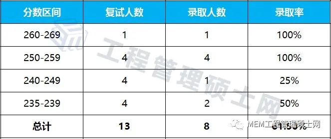 符合复试资格共计13人,进入复试最高分262分,最低分235分;拟录取8人,拟录取最高分262分,最低分236分。
