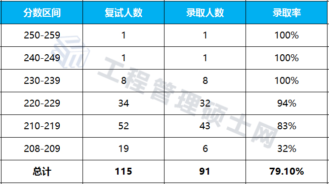 一志愿进入复试共计115人,进入复试最高分252分,最低分209分;拟录取91人,拟录取最高分252分,最低分209分。