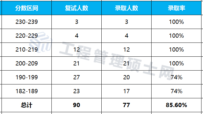 一志愿进入复试共计90人,进入复试最高分235分,最低分182分;拟录取77人,拟录取最高分235分,最低分182分,录取率为85.6%。