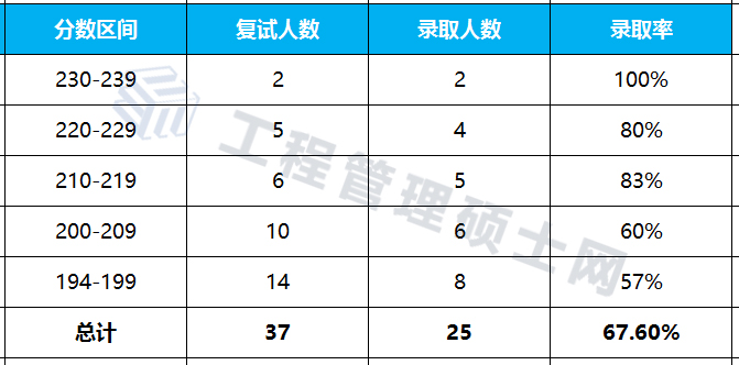 一志愿进入复试共计37人,进入复试最高分233分,最低分194分;拟录取25人,拟录取最高分233分,最低分194分,录取率为67.6%。