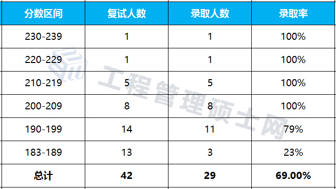 一志愿进入复试共计42人,进入复试最高分232分,最低分183分;拟录取29人,拟录取最高分232分,最低分184分,录取率为69%。