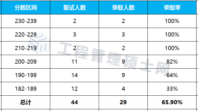 一志愿进入复试共计44人,进入复试最高分235分,最低分182分;拟录取29人,拟录取最高分235分,最低分182分,录取率为65.9%。