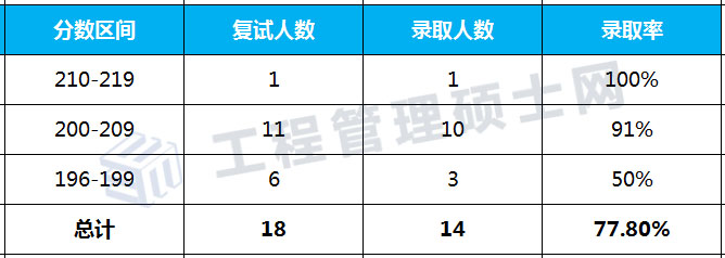 一志愿进入复试共计18人,进入复试最高分218分,最低分196分;拟录取14人,拟录取最高分218分,最低分196分,录取率为77.8%。