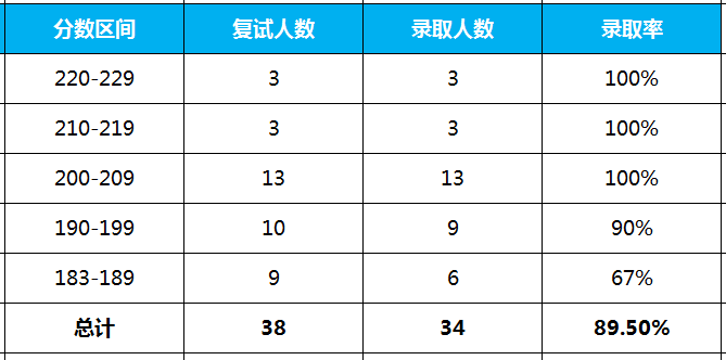 一志愿进入复试共计38人,进入复试最高分226分,最低分187分;拟录取34人,拟录取最高分226分,最低分187分,录取率为89.5%。