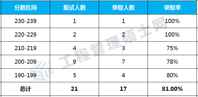 一志愿进入复试共计21人,进入复试最高分237分,最低分194分;拟录取17人,拟录取最高分237分,最低分196分,录取率为81%。