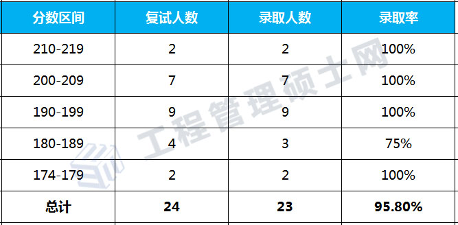 一志愿进入复试共计24人,进入复试最高分214分,最低分174分;拟录取23人,拟录取最高分214分,最低分174分,录取率为95.8%。