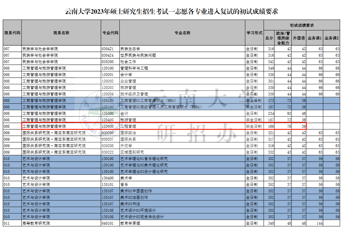 云南大学2023年MEM工程管理硕士复试分数线:168
