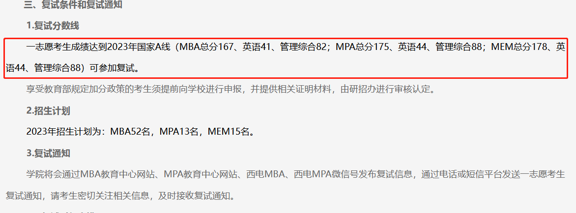西安电子科技大学经济与管理学院2023年全日制硕士研究生招生复试录取工作方案显示,MEM工程管理复试分数线178/44/88;物流工程复试分数线:230/44/88