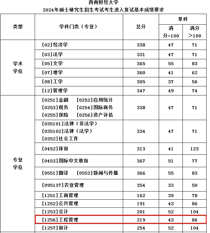 西南财经大学2024年MEM项目管理硕士复试分数线:219/43/86