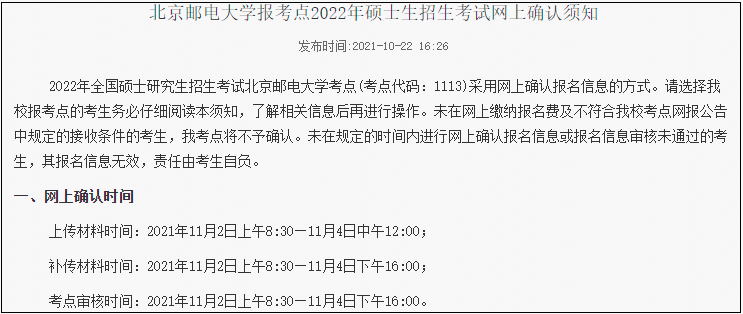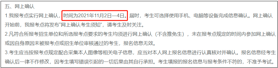 提醒:但一定要注意,同一省份下的各个报考点具体的确认时间要求也不一定相同,一般会短于省份时间,所以,一定要再看下报考点院校官网发布的报考通知,在该文件的下半部分会提及网上确认的相关事宜。