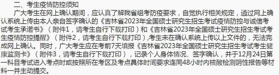 6.请考生在12月1日后随时密切关注吉林省教育考试院官网和各报考点当地政府、考试机构发布的相关信息,我们可能根据疫情发展需要适时调整防疫组考措施。未尽事宜按照按报考点当地政府疫情防控有关要求执行。