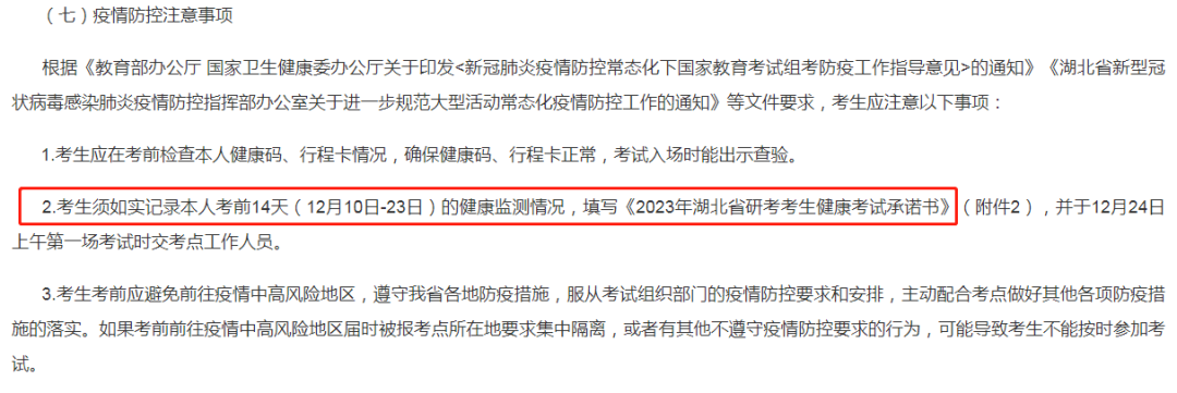 2.考生须如实记录本人考前14天(12月10日-23日)的健康监测情况,填写《2023年湖北省研考考生健康考试承诺书》(附件2),并于12月24日上午第一场考试时交考点工作人员。