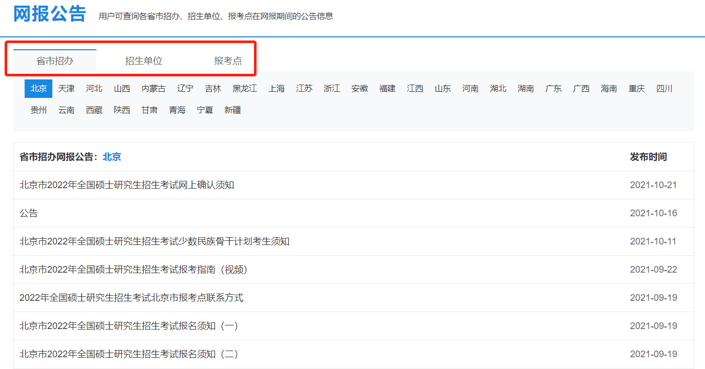研招网的网报公告会公布考研重要信息,并且网报公告还分“省市招办” “招生单位” “报考点”三个不同的层级,可以涵盖大部分的通知。
