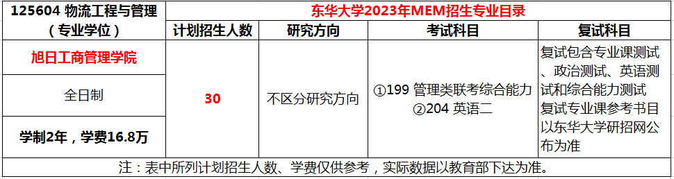 东华大学2023年MEM物流工程与管理计划招生30人,学制2年,学费16.8万/全程。