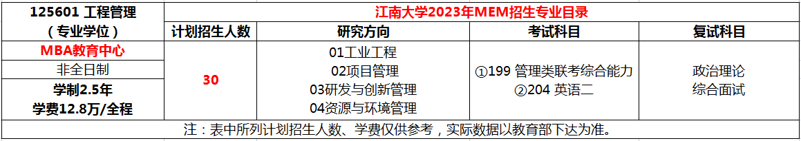 江南大学2023年非全日制MEM学制2.5年,学费12.8万/全程,拟招生30人。