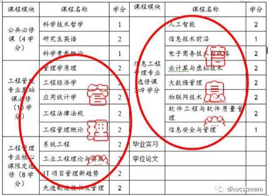 非全日制学习方式,学习年限2.5年(最长不超过5年),其中累计在校学习时间不少于1年。修满34个学分方可毕业。其中公共必修课不少于6学分、工程管理专业基础课不少于10学分、工程管理专业核心课不少于9学分、信息工程管理专业选修课不少于9学分。