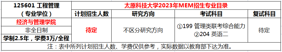 太原科技大学2023年MEM工程管理硕士只招收非全日制在职定向就业人员,考生报名时须征得工作单位同意,复试阶段须与学校及工作单位签订“定向培养协议书”,否则不予复试、录取。学制2.5年,一般安排在周末授课,学费3万元全程。