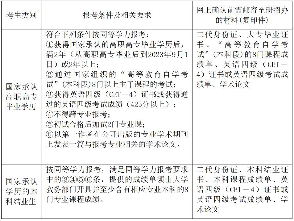 (1)国家承认学历的应届本科毕业生(含普通高校、成人高校、普通高校举办的成人高等学历教育等应届本科毕业生)及自学考试和网络教育届时可毕业本科生。2023年9月1日前考生必须取得国家承认的本科毕业证书或教育部留学服务中心出具的《国(境)外学历学位认证书》,否则录取资格无效。