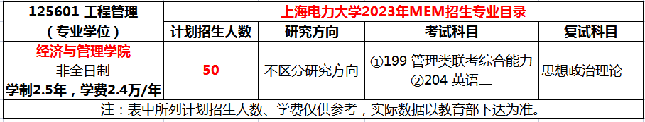 上海电力大学2023年MEM工程管理硕士计划招生50人,学制2.5年,学费2.4万一年。
