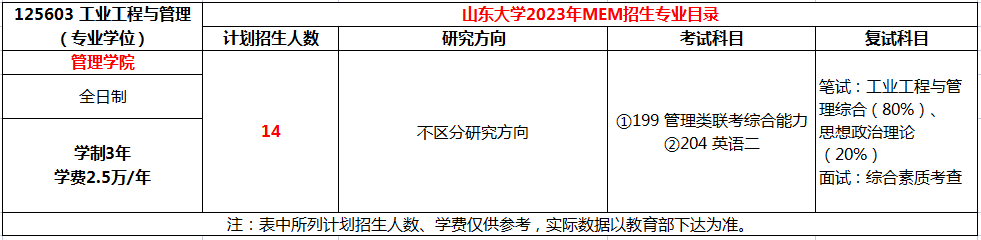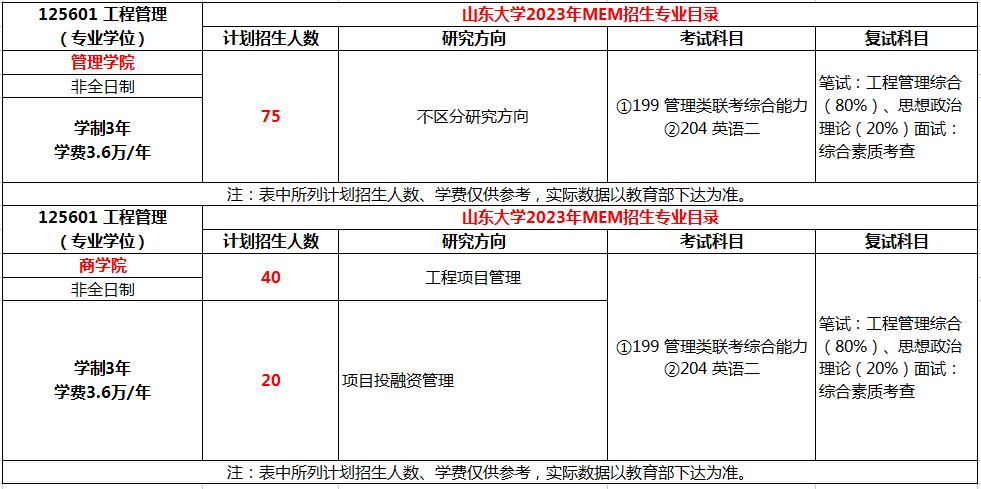 山东大学2023年MEM工程管理硕士(125601)方向管理学院非全日制招生75人,商学院共招生60人,其中工程项目管理方向40人,项目投融资管理方向20人,学制均为3年,学费均为3.6万/年。