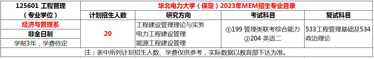 华北电力大学(保定)2023年MEM工程管理硕士非全日制招生20人,学制3年,学费待定。