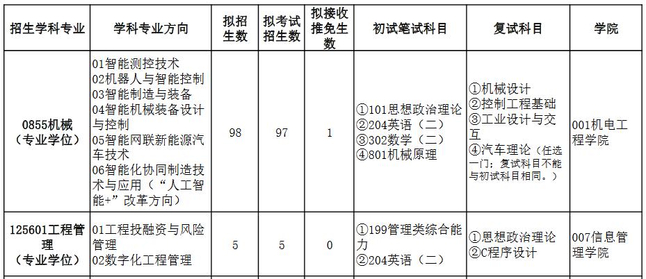 招收仪器科学与技术、控制科学与工程、机械工程、管理科学与工程、计算机科学与技术、信息与通信工程、网络空间安全、电子科学与技术、光学工程、工商管理、应用经济学、数学、马克思主义理论13个一级学科硕士学位研究生。其中,经济管理学院的“管理科学与工程”授予管理学学位(招生代码为120100),信息管理学院“管理科学与工程”授予工学学位(招生代码为087100)。