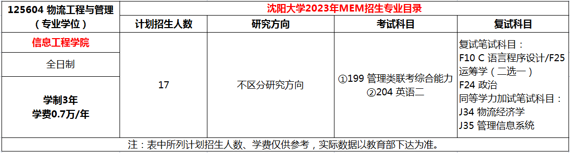 沈阳大学2023年MEM物流工程管理硕士拟招生17人,学制3年,学费0.7万/年。