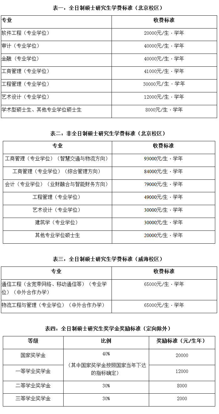 我校按照国家和北京市的规定收取学费,学费标准见表一、表二、表三,同时向符合政策的学生发放国家助学金。符合条件的研究生可申请评选国家奖学金、学业奖学金(标准见表四)以及其他专项奖学金。另外我校设置“助教”、“助管”和“助研”岗位(统称为“三助”岗位),经双向选择承担“三助”岗位的研究生,可以获得相应的岗位津贴。