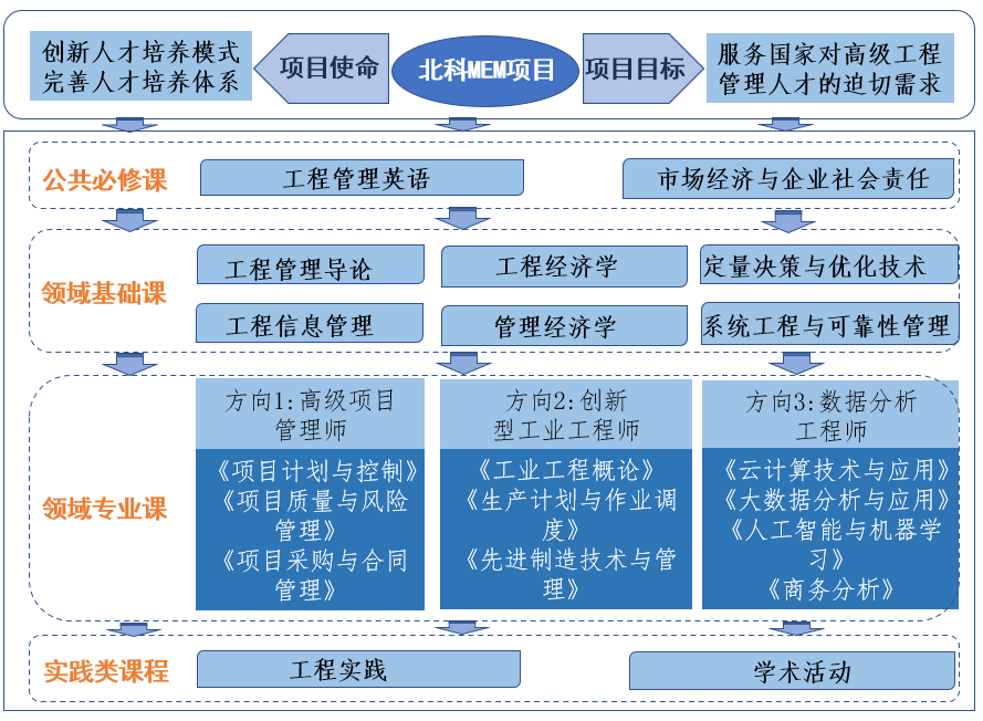 为适应我国现代工程项目对高级管理人才的需求,依托北京科技大学的工科发展背景及经济管理学院的优势学科建设,MEM项目在领域专业课中设置了三类选修课程供学习:项目管理、工业工程管理、大数据与商务分析。