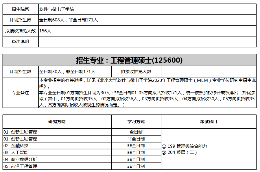 北京大学软件与微电子学院工程管理硕士MEM2023级全日制计划招生30人,非全日制计划招生171人,全日制学费9.9万元全程,非全日制学费18.8万全程,学制均为2年。