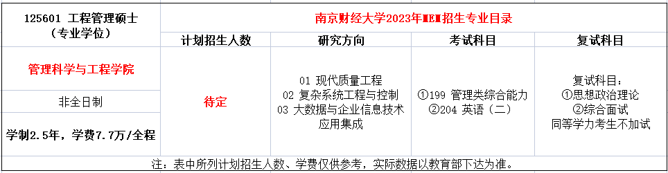 南京财经大学2023年MEM工程管理学费全程77000元,学制2.5年。