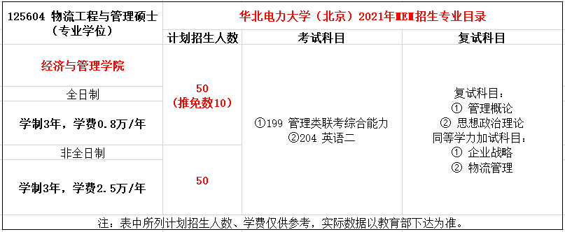 华北电力大学2021年MEM项目(125604)经济与管理学院全日制招生50人,学费每年8000元,非全日制招生50人,学费每年25000元,学制3年。