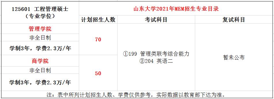 山东大学2021年MEM工程管理硕士(125601)方向管理学院非全日制招生70人,商学院非全日制招生50人,学制3年,学费2.3万/年。