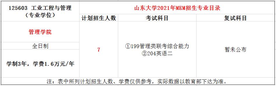 山东大学2021年MEM工业工程与管理(125603)方向全日制招生7人,学制3年,学费1.6万/年。