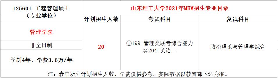 山东理工大学2021年MEM工程管理硕士(125601)方向招生20人,学制4年,学费3.6万/年。