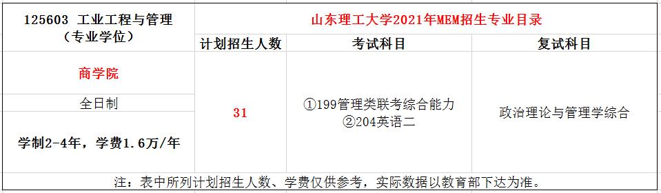 山东理工大学2021年MEM工业工程与管理(125603)方向招生31人,学制2-4年,学费0.6万/年。
