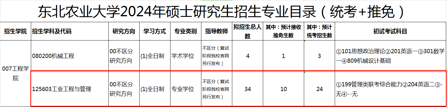 东北农业大学2024年MEM工业工程与管理硕士(125603)全日制招生34人,含推免10人,学制3年,学费0.9万/年。