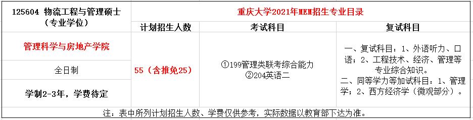 重庆大学2021年MEM物流工程与管理硕士(125604)全日制招生55人,含推免25人,学制2-3年,学费待定。
