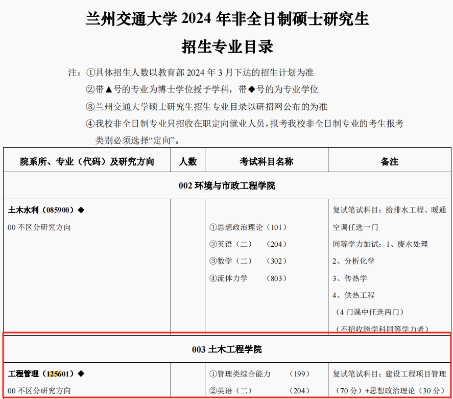 兰州交通大学2024年硕士研究生招生简章及专业目录公布,MEM工程管理硕士非全日制每年学费17000元,学制3年。