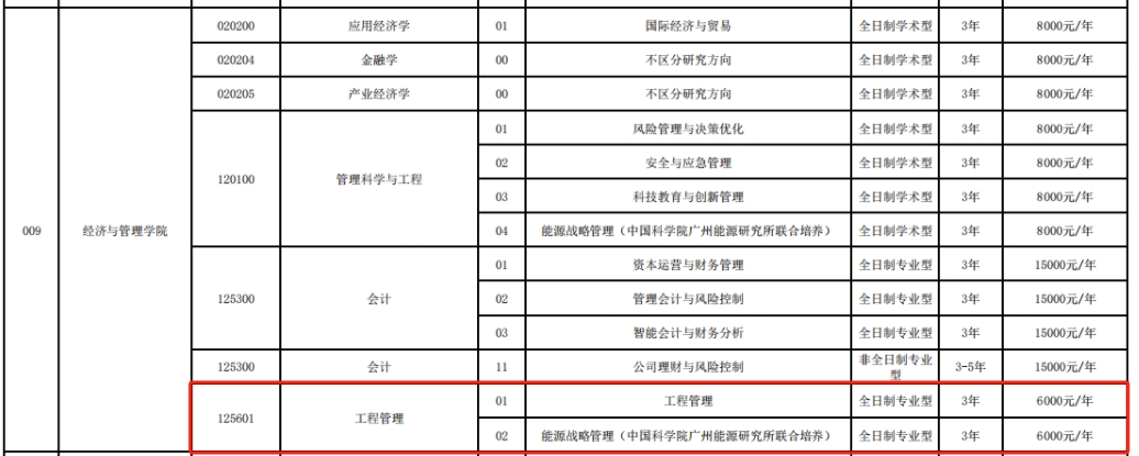 沈阳化工大学2024年MEM全日制学费每年6000元,学制3年,工程管理方向计划招生40人,能源战略管理(中国科学院广州能源研究所联合培养)招生人数待定,学费每年6000元,学制3年
