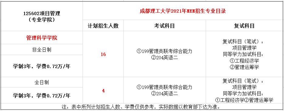 成都理工大学2021年MEM项目管理硕士(125602)非全日制招生16人,学制3年,学费0.72万/年;全日制招生4人,学制3年,学费0.72万/年。