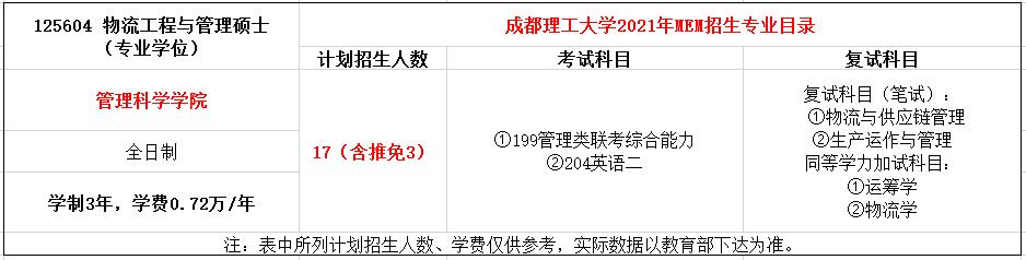 成都理工大学2021年物流工程与管理硕士(125604)全日制招生17人,含推免生3人,学制3年,学费0.72万/年。