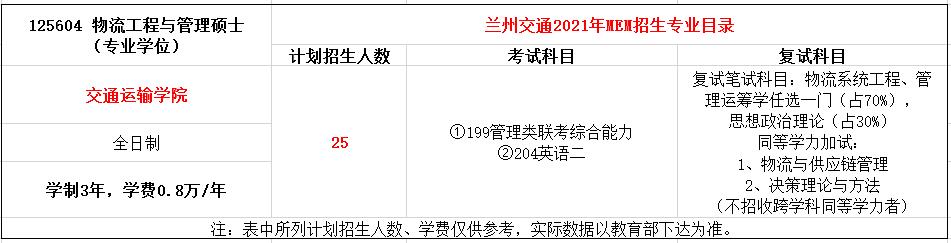 兰州交通大学2021年MEM物流工程与管理硕士(125604)全日制招生25人,学制3年,学费0.8万/年。