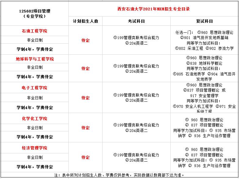 西安石油大学2021年MEM项目管理硕士(125602)石油工程学院非全日制招生人数待定,学制4年,学费待定;