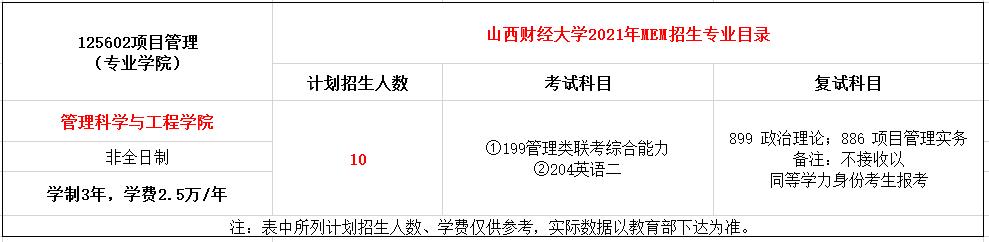 山西财经大学2021年MEM项目管理硕士(125602)非全日制招生10人,学制3年,学费2.5万/年。