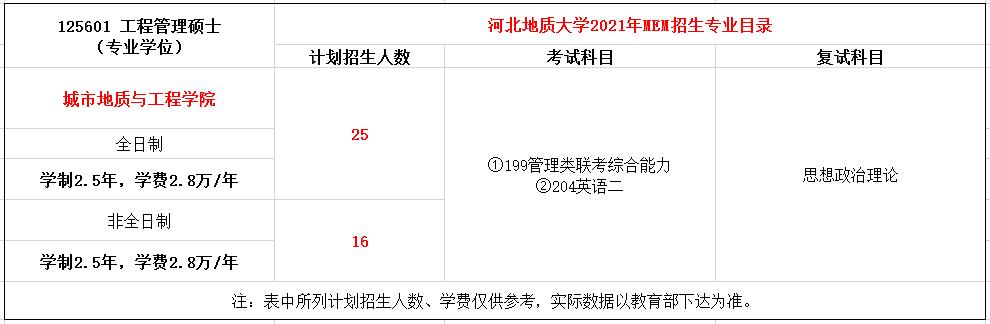 河北地质大学2021年MEM工程管理硕士(125601)城市地质与工程学院全日制招生25人,学制2.5年,学费2.8万/年;非全日制招生16人,学制2.5年,学费2.8万/年。